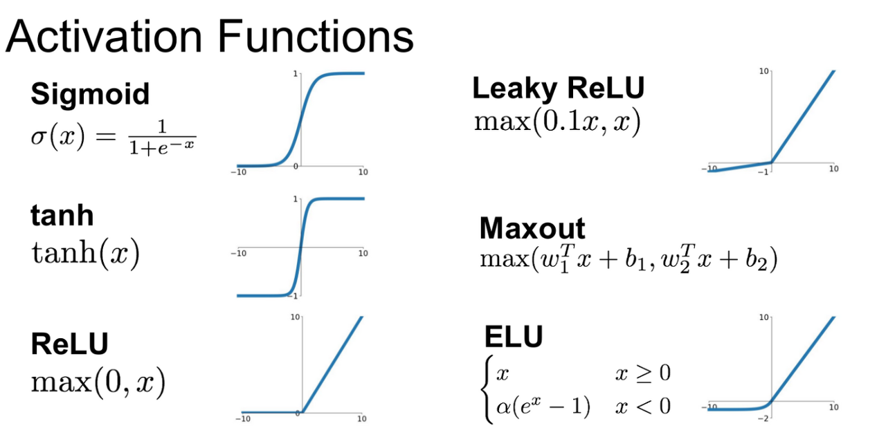 - 대표적으로 Sigmoid function, ReLU, Leakly ReLU 등이 있고, 그 중에서 ReLU를 가장 많이 씀
