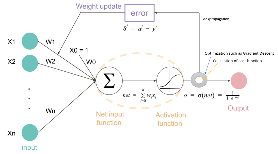 - Weighted sum을 한 값을 , Activation function(Sigmoid)를 거친 값을 라 하자.