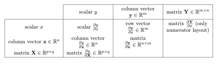 $X=\mathsf{M}_{n \times m}(\mathbb{R})$에서 스칼라 $y$로 가는 변환 $f$에 대해, $\dfrac{\partial y}{\partial X}$는 행렬 각각의 element에 대한 단일 미분값으로 정의된다. 단일로 보면, $0$차원에서 $0$차원의 변환이므로 $0$차원의 scalar가 나오게 되어서 동일한 size($n\times m$)의 행렬이 반환이 된다.